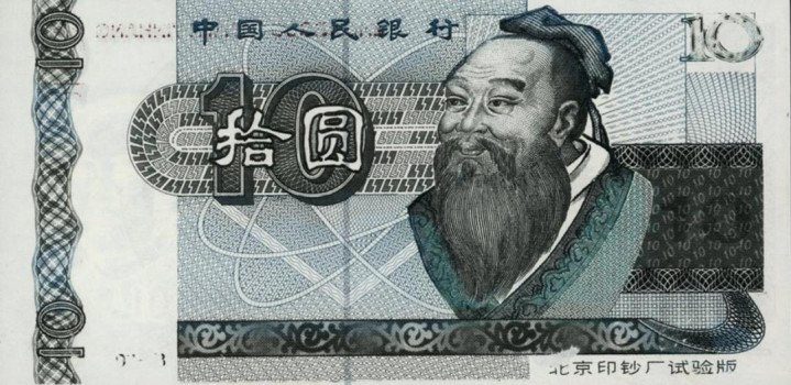 正面:黑色与蓝绿色配色,中间是孔子头像,左侧为毛主席水印;
